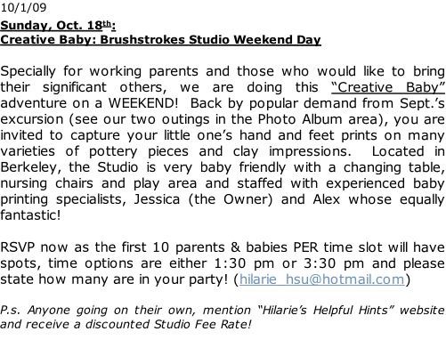 Visit “Creative Baby” for photos & info. Back by popular demand & now a monthly excursion (see our outings in the Photo Album area), you are invited to capture your little one’s hand and feet prints on many varieties of pottery pieces and clay impressions. Located in Berkeley, the Studio is very baby friendly with a changing table, nursing chairs and play area and staffed with experienced baby printing specialists, Jessica (the Owner) and Alex whose equally fantastic! Bring your whole family and do generational plates, mugs, picture frames, the sky’s the limit, especially for this holiday season!